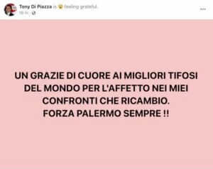 Words, those of Tony Di Piazza, which do nothing but confirm the farewell to Palermo. Through a post on his Facebook profile, the Italian-American greeted the rosanero fans: “UN GRAZIE DI CUORE AI MIGLIORI TIFOSI DEL MONDO PER L’AFFETTO NEI MIEI CONFRONTI CHE RICAMBIO.