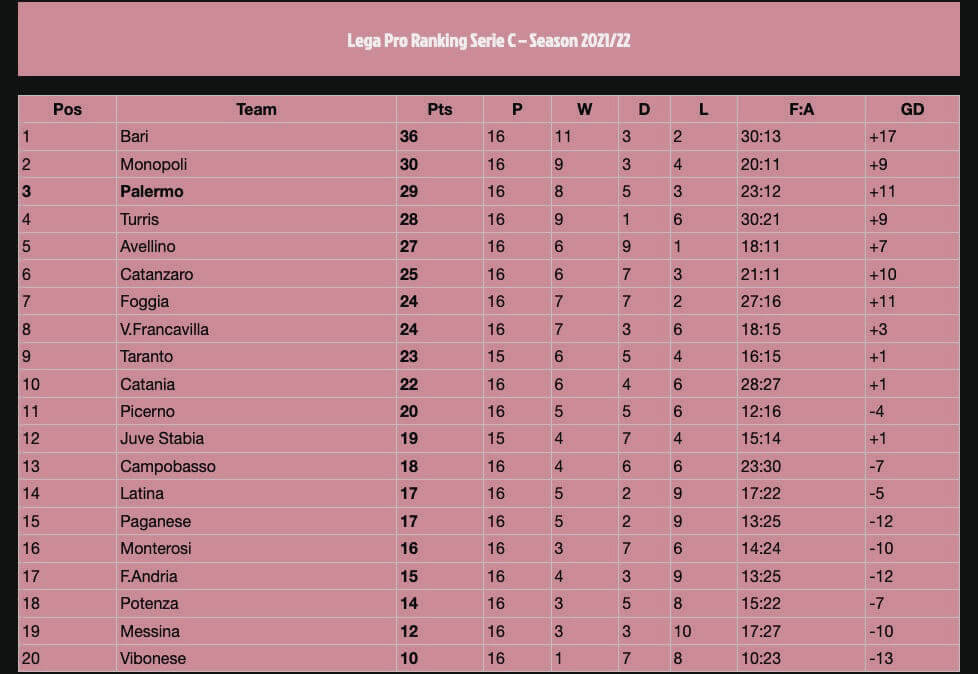 Lega Pro Ranking 2021/22 – Serie C